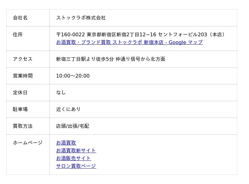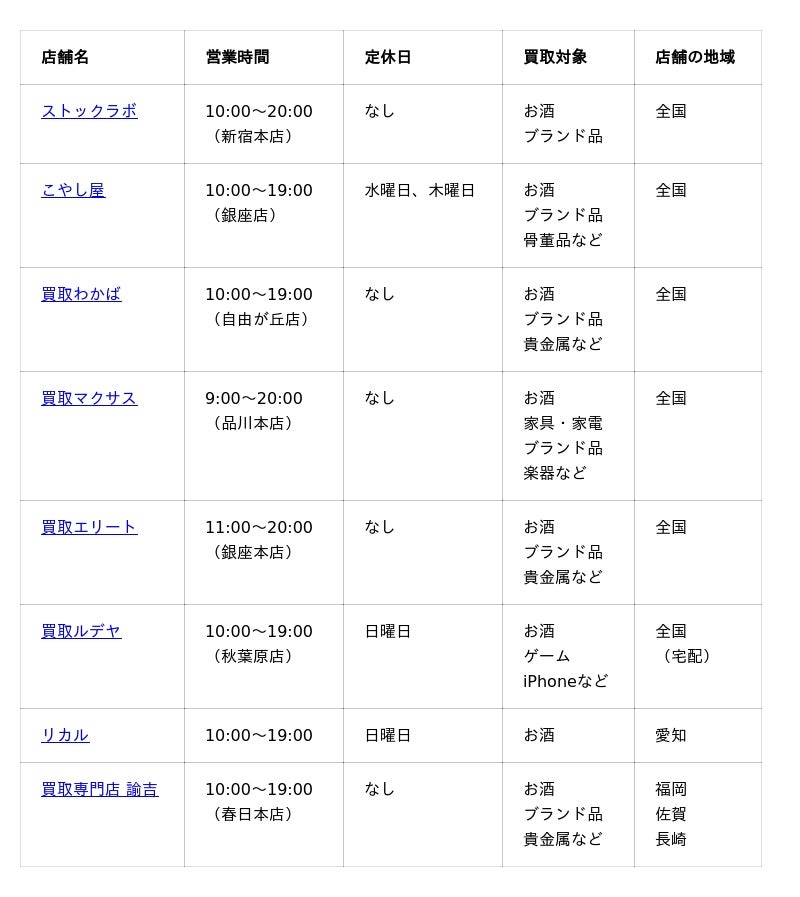 新宿でシャンパン買取が得意なお酒買取業者は、本記事で紹介した以下の業者です。