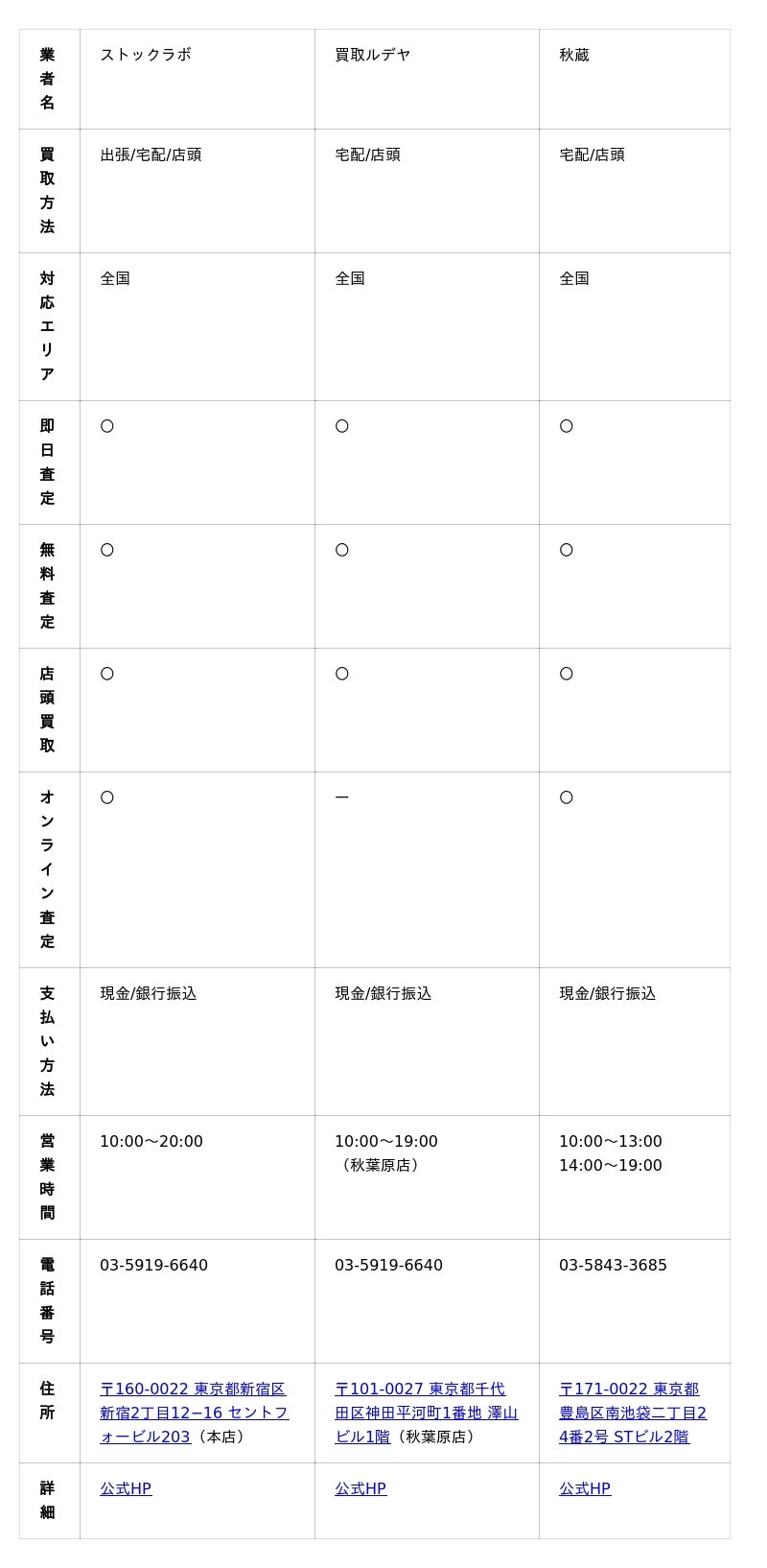移転前の新大久保店時より何度か利用しています。秋葉原に移転してから店内が丸見えです。買い取り金額等はHP通りです。買い取り予約確定後は金額変わりません箱などに問題が無ければ満額です。減価された事はありません悪い評価がありますがシステムを理解出来て無いのでは?2023年7月に再訪しましたが、ガラスにシートが貼られて外から丸見えでは無くなりました。