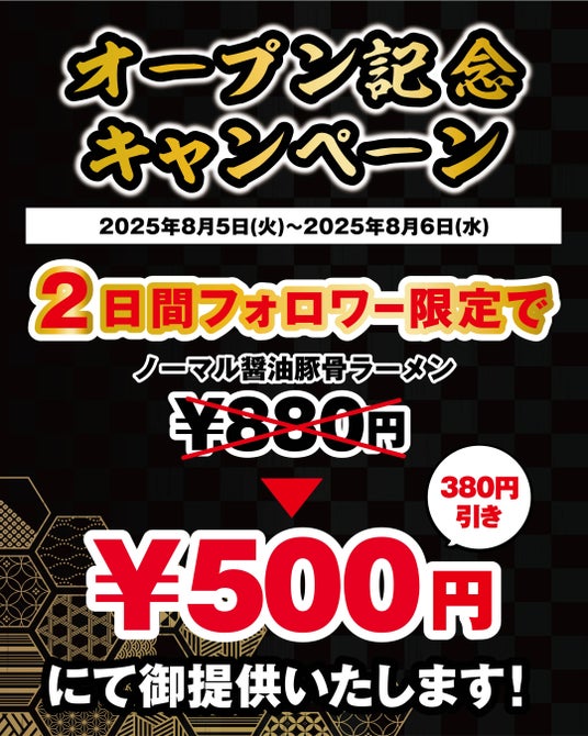 1.Instagram公式アカウントをフォローした方限定で、2025年8月5日(火)~2025年8月6日(水)の2日間で「ノーマル醤油豚骨ラーメン」をワンコイン500円でプレゼント!