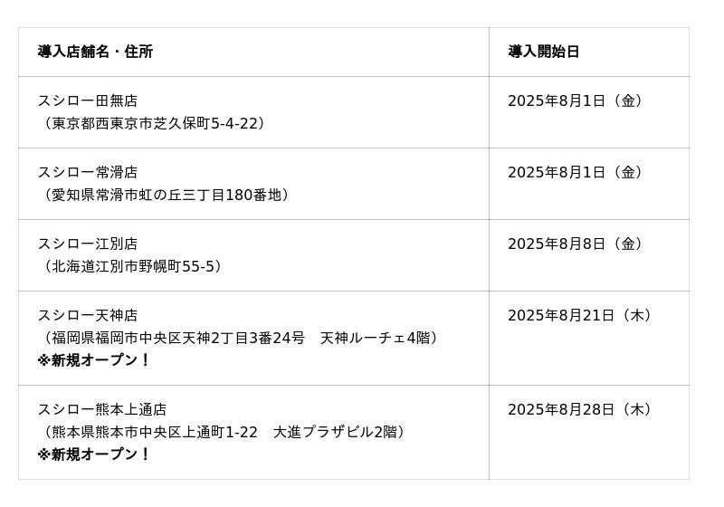 8月は、福岡県・熊本県の繁華街に新規オープンする「天神店」、「熊本上通店」をはじめ、東京都・愛知県・北海道でも、リニューアルオープンに合わせ「デジロー」を導入いたします。8月末時点で、国内の導入は115店舗となります。西鉄天神大牟田線「西鉄福岡(天神)駅」から徒歩4分の「天神店」や、熊本市電「通町筋駅」から徒歩1分の「熊本上通店」は、公共交通機関でのアクセスもよく、お買い物ついでにも気軽におすしをお楽しみいただけます。スシローではこれまでも様々な面でデジタルの力を活用してきましたが、今後も“うまいすし”に加えて、新たな店舗体験をご提供することで、いつ来ても楽しんでいただける店舗空間を作り続けたいと考えています。