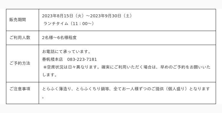 創業140余年の老舗ふぐ料理店「下関春帆楼本店」(所在地:山口県下関市、総支配人:手柴 鋼太郎、以下:春帆楼本店)は、2023年8月15日(火)~9月30日(土)の期間限定で、当日予約可能なぷらっと本店ふく料理プランを昼食限定で販売いたします。