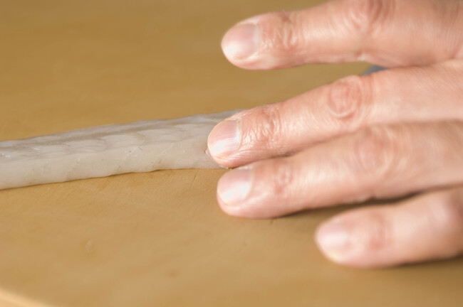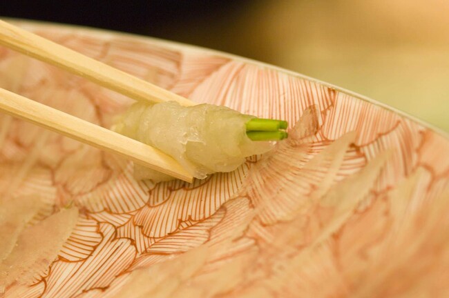 ふく刺しの身上は皿の絵柄が透けて見えるほど薄く引く包丁さばきが醍醐味。それは「ふく料理公許第一号」の伝統のなせる薄造りの技です。そして、美しく繊細なこの技を支えているのが丹念な仕込みです。さばいたふくをさらしに巻き、時間と温度に細心の注意を払いながら秘伝の製法で一昼夜おくことで身をほどよく引き締め、ふく独特の食感と旨みを引き出します。