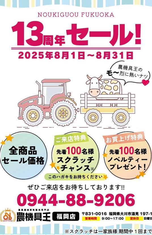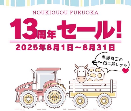 「農機具王 福岡店」は、おかげさまで2025年8月1日に開店13周年を迎えました。これまで支えてくださった地域の生産者の皆様をはじめとするすべてのお客様に感謝の気持ちを込めて、周年記念キャンペーンを開催いたします。