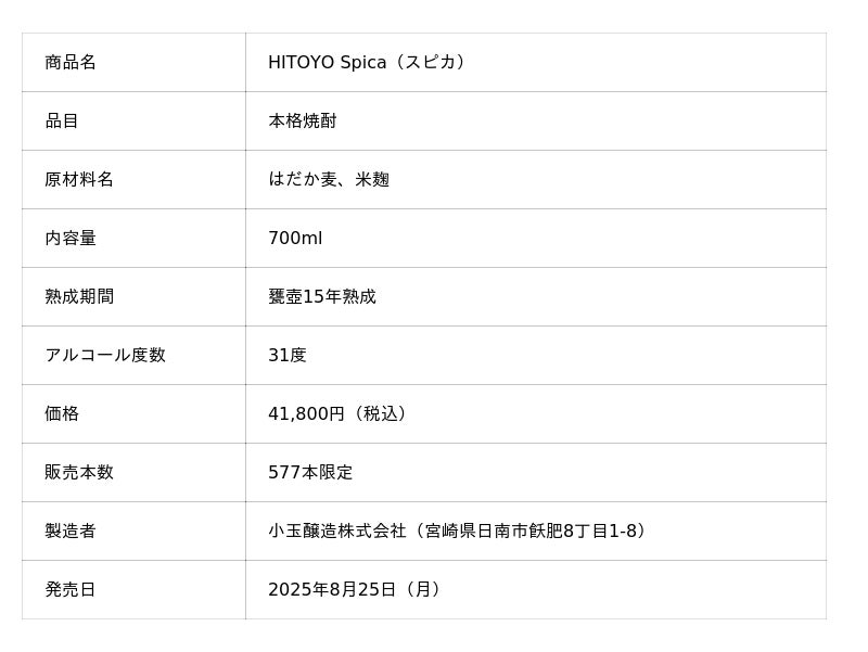 「地域のストーリーを承継し、次の世代へ紡いでいく。」をミッションに掲げるLocal Local株式会社(本社:宮崎県宮崎市、代表取締役:石橋 孝太郎、以下 Local Local)は、当社で販売している焼酎ボトラーズブランド「HITOYO(ヒトヨ)」から、15年熟成の麦焼酎「HITOYO Spica(ヒトヨ スピカ)」を全577本限定で2025年8月25日(月)に販売開始いたします。