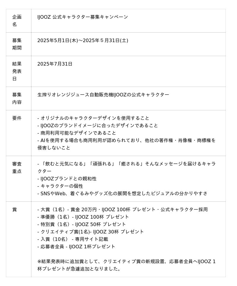 生搾りオレンジジュースの自動販売機を展開するIJOOZ株式会社(東京都港区六本木2-3-2)は、ブランド初となる公式キャラクター公募企画「IJOOZキャラクターコンテスト2025」において、厳正なる審査の結果、受賞作品を決定・発表いたしました。本コンテストでは、「IJOOZの未来を担うキャラクター」をテーマに、全国から多くの情熱とアイデアあふれる作品が寄せられました。どの作品も、IJOOZのブランドや世界観に対する深い理解と愛情を感じさせる力作ばかりで、社員一同、感動の連続でした。
