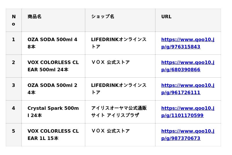 Qoo10(https://www.qoo10.jp/)サイト上、「炭酸水」カテゴリーの販売個数に基づいたランキングです。