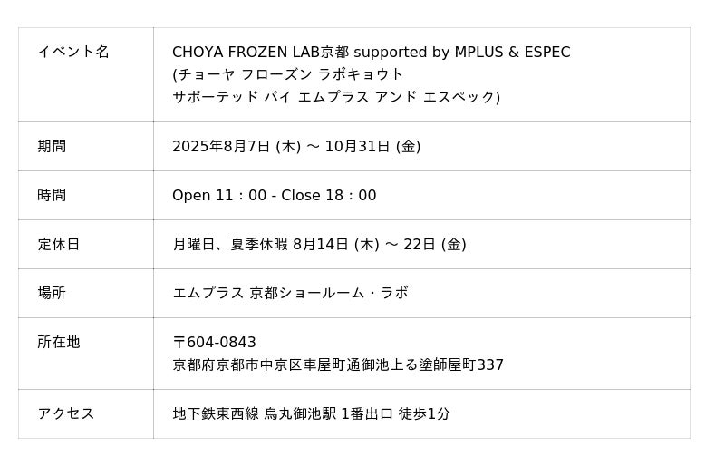 チョーヤ梅酒株式会社 (本社:大阪府羽曳野市、社長:金銅重弘、以下チョーヤ) は、株式会社エムプラス (本社:東京都渋谷区、社長:前野欽哉、以下エムプラス) が開発した-50度の液体急速冷凍機とエスペック株式会社 (本社:大阪府大阪市、社長:荒田知、以下エスペック) が開発した-70度の超低温ショックフリーザーにAI技術でレシピ開発を行った期間限定ドリンク3種が楽しめるポップアップイベント「CHOYA FROZEN LAB京都 supported by MPLUS & ESPEC (チョーヤ フローズン ラボキョウト サポーテッド バイ エムプラス アンド エスペック)、以下CHOYA FROZEN LAB京都」をエムプラスの京都ショールーム・ラボにて、8月7日 (木) から10月31日 (金) まで期間限定で開催いたします。