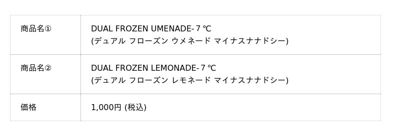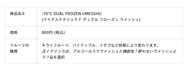 また、この「-70℃ DUAL FROZEN FRUIT」を氷の代わりに使用した「-70℃ DUAL FROZEN FRUIT UMESSHU (マイナスナナジュウド デュアル フローズン ウメッシュ) 」も提供します。
