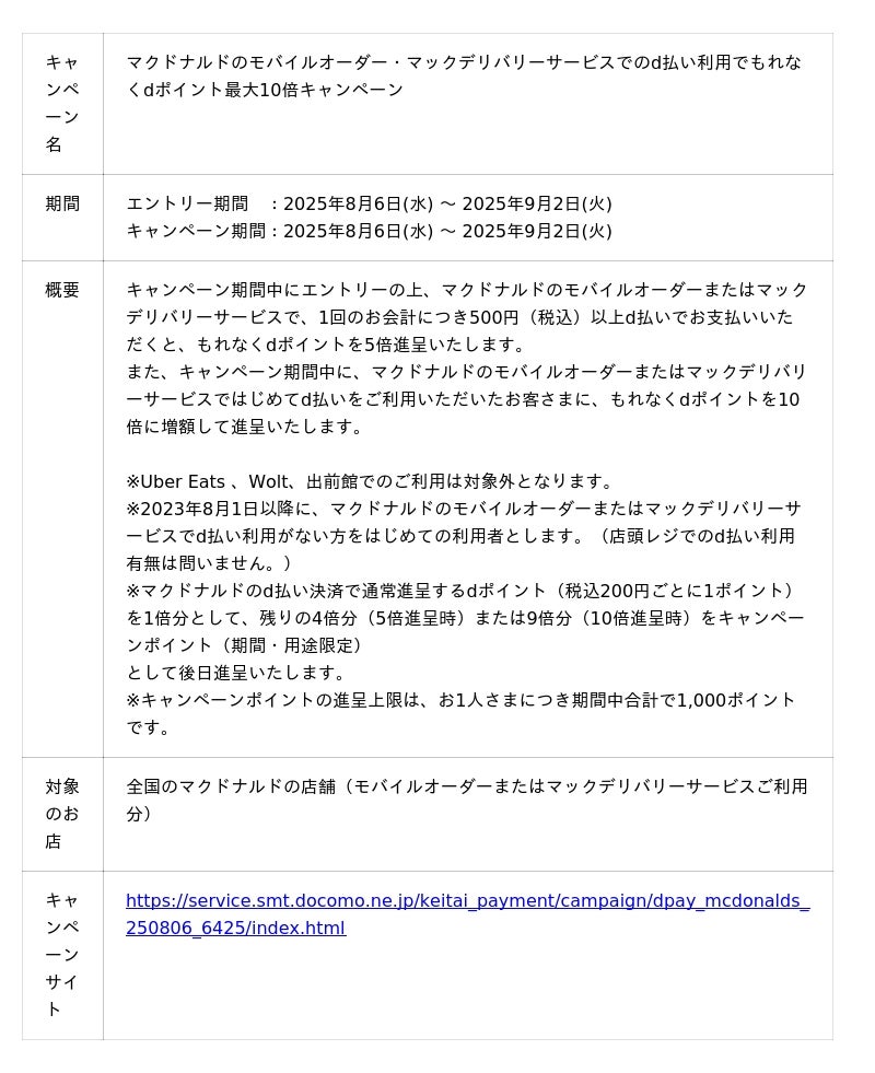 本キャンペーンへの参加にはエントリーが必要です。エントリー期間中にキャンペーンサイトからエントリーの上、マクドナルドのモバイルオーダーまたはマックデリバリーサービスで「d払い(R)」にて※11回のお会計につき500円(税込)以上お支払いいただくと、もれなくdポイントを5倍進呈いたします※2。また、キャンペーン期間中に、マクドナルドのモバイルオーダーまたはマックデリバリーサービスではじめて「d払い」をご利用いただいた方に、もれなくdポイントを10倍に増額して進呈いたします※2。詳細はキャンペーンサイトにてご確認ください。