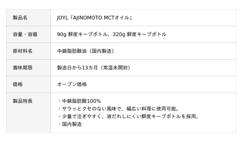株式会社J-オイルミルズ(東京都中央区、代表取締役社長執行役員 CEO:春山 裕一郎)は、中鎖脂肪酸(MCT)を100%使用し、さらっとクセがない風味で、幅広い料理に使える新製品 JOYL「AJINOMOTO MCTオイル」を8月20日(水)より全国で順次発売いたします。