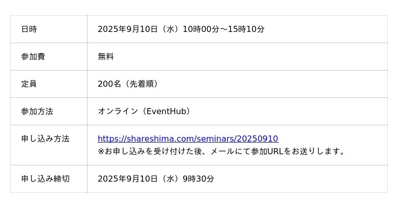 ※当セミナーは、ハイブリッド開催(リアル会場+オンライン配信)です。シェアシマでは、このうち、オンライン配信の聴講を希望される方の申込受付を行っています。ぜひお気軽にご参加ください。