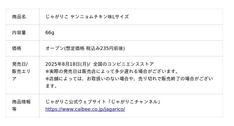 カルビー株式会社(本社:東京都千代田区、代表取締役社長兼CEO:江原 信)は、独自の製法で“はじめカリッとあとからサクサク”の心地よい食感が楽しめる「じゃがりこ」ブランドより、クセになる甘辛ソースと、ピリ辛コクうまな味わいが楽しめる『じゃがりこ ヤンニョムチキン味Lサイズ』を2025年8月18日(月)から全国のコンビニエンスストアで期間限定発売します(同年11月下旬終売予定)。