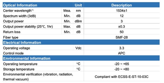 「AER-SCASE-00-00-M」は、Cバンド領域におけるASE(Amplified Spontaneous Emission)光源モジュールです。中心波長 1534±1 nm、最小出力 3 dBm、APC(自動出力制御)機構を搭載し、冗長化対応の電源を採用することで、宇宙グレードに対応した高い信頼性を確保しています。光ファイバージャイロスコープ・センシング、光計測システム、光ファイバー特性評価など多様な分野での応用が期待されます。