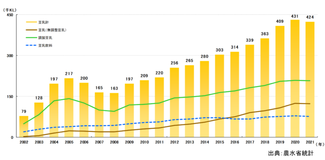 国内の豆乳生産量は10年前と比較して2倍近く増加、また2020年まで10年で連続過去最高を更新しております。2021年は前年を若干下回ったものの、依然として好調な市場と言えます。