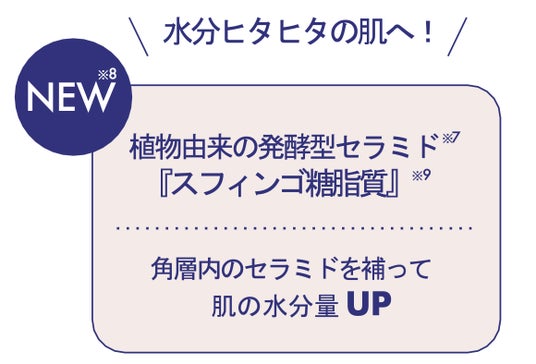 うるおいを与えるだけにとどまらず、肌が本来持つ自らうるおう力のサポートを目指し、モイストシリーズとして初めて「発酵型セラミド※7」を採用。セラミドを補って角層内の水分量をアップさせ、外的刺激に負けないうるおいがヒタヒタに満ちた肌へ。