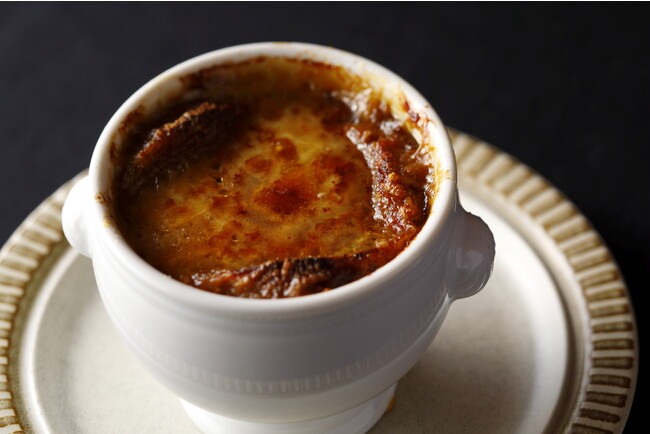 1品目にはお肉の魅力をさらに引き立たせるプレミアムな「オニオングラタンスープ」をご用意。雑味のない深い甘みが特徴の「淡路島産玉ねぎ」を約半日かけて飴色になるまで炒め、そこに4日間じっくり煮込んで旨みとコクを凝縮させた「ダブルビーフコンソメスープ」を合わせます。仕上げに「グリュイエールチーズ」と「パルメザンチーズ」の2種類をたっぷりと使用したアツアツとろとろのオニオングラタンスープをぜひお愉しみください。