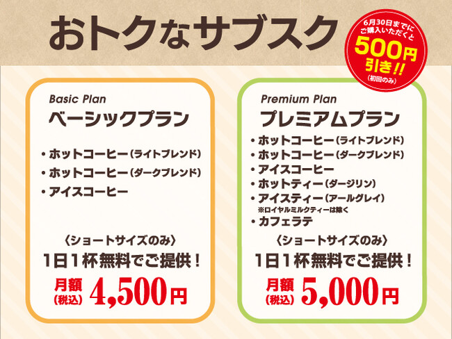 こだわりのコーヒー等が1日1杯飲める月額サービス(自動更新)も6月1日より新登場いたします。