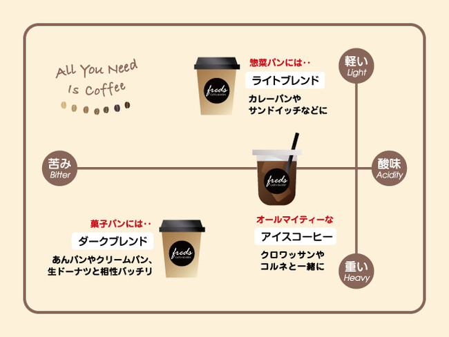 プレーンなパンや惣菜パンには軽やかな口当りのコーヒーを、スイーツのような重めのパンには苦み傾向のコーヒーが基本。同調したり、補うような組み合わせがおすすめです。