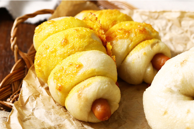粗挽きソーセージにベーグル生地を巻き、チーズをのせて焼き上げたお子様も大好きな惣菜系ベーグルです。