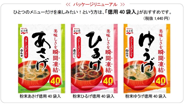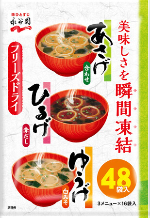 株式会社 永谷園(社長:成田 健一、東京都港区)は、フリーズドライ粉末タイプの即席みそ汁「フリーズドライ あさげ」「同 ひるげ」「同 ゆうげ」が、徳用タイプで気軽に楽しめる「あさげ・ひるげ・ゆうげアソート 48 袋入」(税抜1,800 円)を、2023 年3 月6 日(月)にAmazon ほかEC サイトにて発売を開始いたしました。 1974 年に発売した粉末タイプのあさげシリーズは、購入者から品質満足度で高い評価を得ている当社のロングセラー商品です。しかし、価格面では「もう少し気軽に使用したい」とのお声も頂戴しておりました。そこで今回、市販の粉末タイプのあさげ・ひるげ・ゆうげと同品質の3 メニューを、それぞれ16 袋詰め合わせた「徳用タイプ」をご用意いたしました。