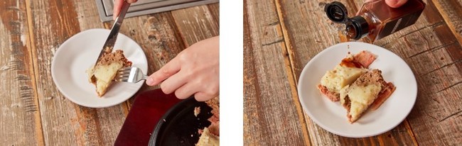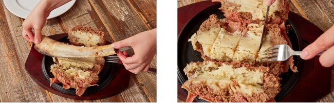 4. 中央部分にナイフを入れ、骨に沿って上部のお肉、マッシュポテトを骨から外します