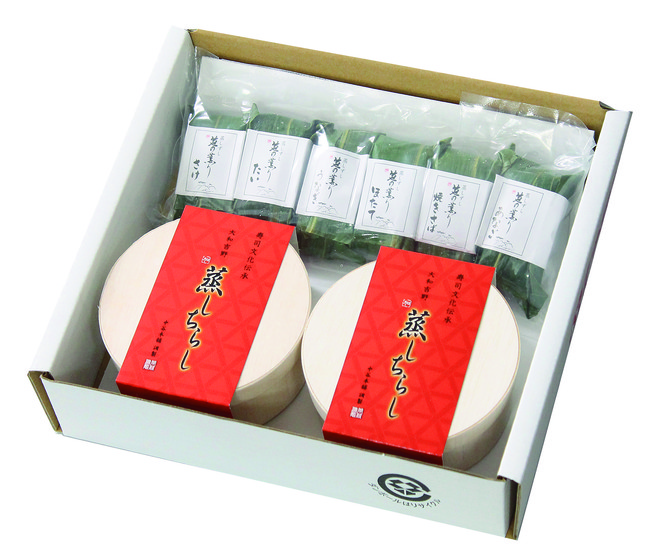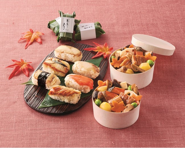 松茸や栗・銀杏など、秋の味覚を盛り込んだ吹き寄せちらしと、6種のネタの笹巻き寿司の詰合せです。