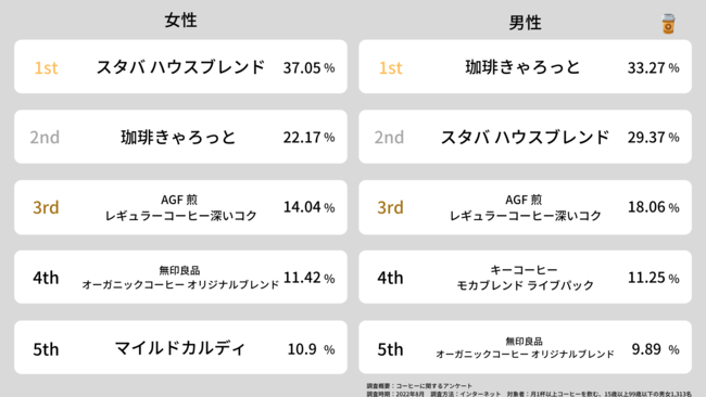男女別で見てみると、全体1位のスターバックス ハウスブレンド、2位の珈琲きゃろっとが逆転する結果となりました。