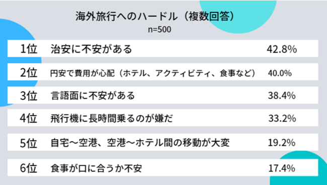 「海外旅行へ行きたい」と回答した人が約半数いる一方で、海外旅行へ行きたくないと感じる人もいることが明らかになりました。本調査では、新型コロナウイルス感染症に対する懸念以外に考えられる海外旅行へのハードルを聞いたところ、1位「治安面の不安(42.8%)」、2位「円安による物価高騰(40%)」、そして3位「言語面の不安(38.4%)」と、現在注目されている円安、またウクライナ侵攻による影響や、現地での滞在における安全面などにハードルを感じる方が多いことが明らかになりました。特に最近の急激な円安の影響で、海外の滞在先での食事や買い物等の費用が多くかかってしまうことへの不安も、前質問「海外旅行へ行きたい」と答えた人が49.8%にとどまった要因だと考えられます。