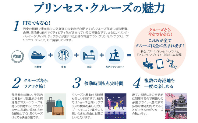 「海外旅行へのハードル」として上位にランクインしていた「円安」についても、日本円でお支払いいただく基本料金プラン「プリンセス・スタンダード(クルーズ代金)」には船での移動費、食費、宿泊費など全てが含まれています。さらに、「ビバレッジ・パッケージ」、「無料高速Wi-Fiメダリオン・ネット」と「クルー・アプリシエーション(チップ)」の3つのサービスが含まれる「プリンセス・プラス」、「プリンセス・プラス」の3つのサービスに加えて、「スペシャリティ・レストラン2回無料」、「フォトパッケージ」の5つのお得なサービスが含まれる2022年7月に発表された新料金プラン「プリンセス・プレミア(https://www.princesscruises.jp/campaign/cruisepackages/)」もご用意しています。そのため、一般的な海外旅行と比較してみても外貨の使用頻度が少なく、円安の影響を受けずにクルーズ旅行をお楽しみいただけます。