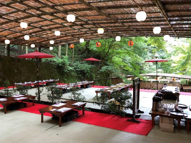 京都市内とは比べものにならないほど涼しく、川床のお食事場所は10度近く気温が低い日もございます!