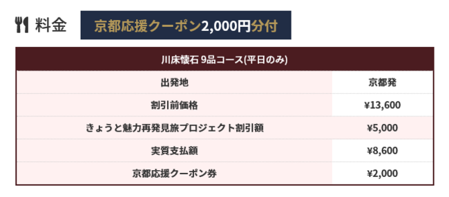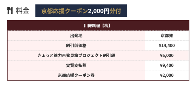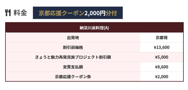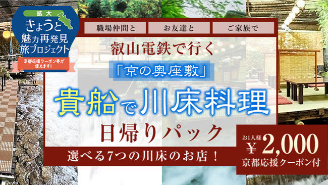 株式会社フォーティーズ(本社:大阪市鶴見区、代表取締役 岡武史)は8月31日迄延長になった「きょうと魅力再発見旅プロジェクト」の対象商品として叡山電鉄で行く「京の奥座敷」 貴船で川床料理日帰りパックツアーのオンライン販売を開始しました。京都府・兵庫県・滋賀県・三重県・福井県・和歌山県・奈良県在住の方のみ対象となっております。※大阪府在住の方は対象外となりましたのでお申込み頂けません。ご注意ください。商品詳細はこちら叡山電鉄で行く「京の奥座敷」 貴船で川床料理日帰りパックhttps://4trip.jp/kyoto_kibune/上記商品以外のお得な情報をお届けする公式LINE追加はこちらhttps://lin.ee/JAOTwl0