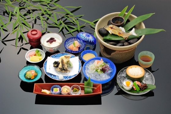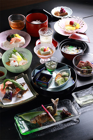 食べる直前に揚げるアマゴの天ぷらや貴船の水で泳がせた鮎の塩焼きなど、川魚生簀(いけす)料理がたっぷり楽しめる会席です。