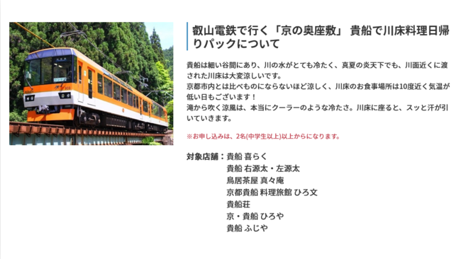 叡山電鉄で行く「京の奥座敷」 貴船で川床料理日帰りパックについて