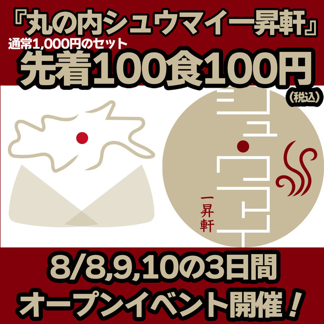 名古屋市内にて「すし昇」などを展開する株式会社イート(代表:小木曽昇平)「丸の内シュウマイ一昇軒」を2022年8月8日にオープンすることを記念して、8月8日~10日の3日間、通常1,000円(税込)のセットを毎日先着100食100円(税込)にて提供するイベントの開催を決定。