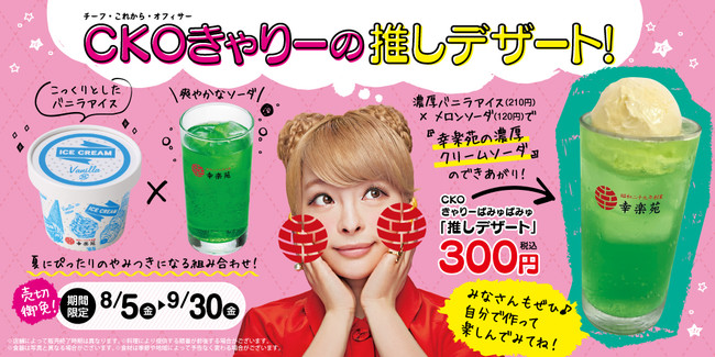 作ろう!という企画です。こってりとした濃厚バニラアイスと爽やかなメロンソーダを合わせた、夏にぴったりのやみつきになるアレンジレシピを紹介しています。幸楽苑では、お客様がハッピーになれる企画を用意して皆様のご来店をお待ちしております。