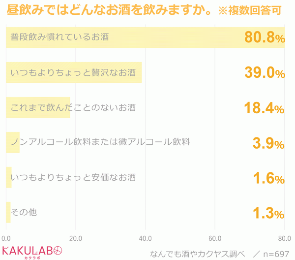 そんな抗いがたい魅力をもつ昼飲みでは、どんなお酒が飲まれているのでしょうか。複数回答可で聞いてみたところ、「普段飲み慣れているお酒」が最も多かったですが、「いつもよりちょっと贅沢なお酒」にも多くの支持が集まりました。
