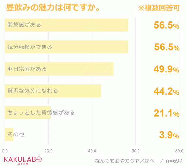 では、昼飲みの魅力は何なのでしょうか。“昼飲みする派”を対象に複数回答可で聞いてみたところ、「開放感がある」と「気分転換ができる」が同率の57%でトップでした。次いで、「非日常感がある」50%、「贅沢な気分になれる」44%と続きます。