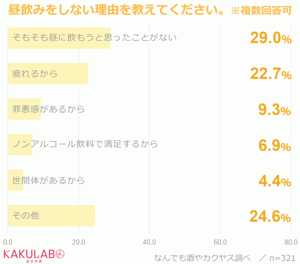 今回のアンケートでは7割近くが“昼飲みする派”でしたが、残りの約3割は“昼飲みしない派”でした。そこで“昼飲みしない派”を対象に、昼飲みをしない理由を複数回答可で聞いてみたところ、最も多かったのは「そもそも昼に飲もうと思ったことがない」29%で、その次が「その他」25%でした。