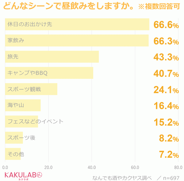 そこで、“昼飲みする派”を対象に、どんなシーンで昼飲みをするのかを複数回答可で聞いてみたところ、最も多かったのは「休日のお出かけ先」67%、次いで「家飲み」66%、「旅先」43%、「キャンプやBBQ」41%と続きます。