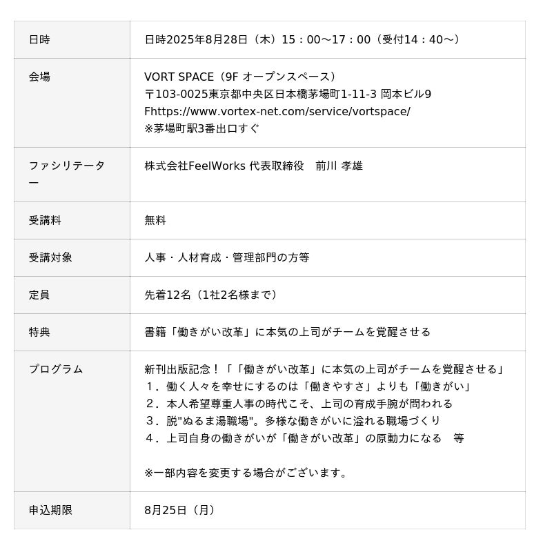 研修事業と出版事業を営む株式会社FeelWorks(代表取締役:前川 孝雄、本社:東京都中央区、以下FeelWorks)は、代表・前川孝雄の新刊『「働きがい改革」に本気の上司がチームを覚醒させる』の発売を記念し、著者本人が登壇する出版記念セミナーを、2025年8月28日(木)に開催いたします。