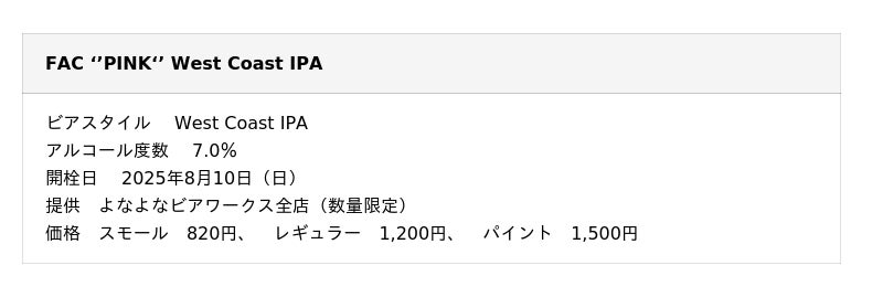 「FAC ‘’PINK‘’ West Coast IPA」は、よなよなビアワークス各店でのみ提供される数量限定のビールです。新種のホップ「PINK」が織りなす、個性豊かで華やかな香りを、この機会にぜひお楽しみください。