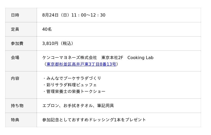 ケンコーマヨネーズ株式会社(東京本社:東京都杉並区、代表取締役社長:島本 国一、以下「当社」)は、当社で運営する一般のお客様向けの料理教室「キッチンスペース831」にて、8月24日の”ドレッシングの日”を通じて、野菜の魅力を再発見できる特別イベントを開催します。おすすめドレッシングのお土産付きです。
