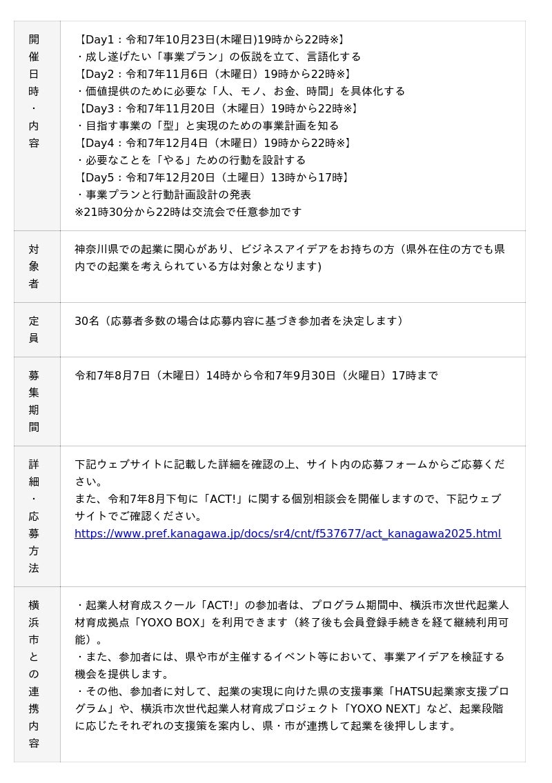 県では、有望なベンチャー企業の創出に向けて、起業に関する啓発事業や起業準備者への支援事業を実施しています。このたび、県と横浜市の連携事業として、起業に関心を持つ学生や社会人などを対象にした起業人材育成スクール「ACT!」を新たに開催することとしましたので、お知らせします。
