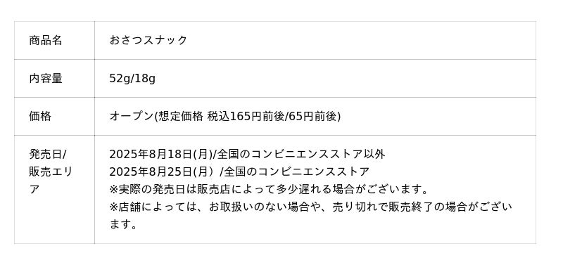 カルビー株式会社(本社:東京都千代田区、代表取締役社長兼CEO:江原 信)は、さつまいものやさしい甘みをふんわりとした軽い食べ心地で楽しめる『おさつスナック』を、秋冬限定商品として、2025年8月18日(月)から全国のコンビニエンスストア以外の店舗で先行して期間限定発売します。コンビニエンスストアでは同年8月25日(月)から発売します(2026年2月下旬終売予定)。