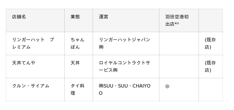 出店店舗については、国内外から高い評価を得ており、予約が取れない名店として知られている東京割烹「くろぎ」の黒木純氏が監修したとんかつ専門店「廚 くろぎ じゅんちゃん」や、ミシュランガイドの星を獲得するなど、世界的に高い評価を得ている銀座おのでらによる新業態の海鮮丼専門店「海鮮丼 銀座おのでら 羽田空港第一ターミナル店」、ジェラートの発祥地イタリア・フィレンツェの老舗ジェラートショップ「Badiani」(関東初出店)の11店舗が羽田空港初出店*2。