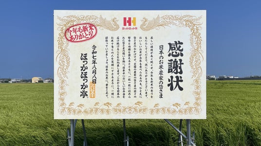 持ち帰り弁当事業のパイオニアである「株式会社ほっかほっか亭総本部(本社:大阪府大阪市、代表取締役会長兼社長:青木達也)は、2025年8月8日のお米の日に合わせて、日本のお米農家の皆さまへむけた感謝の意を評すべく、徳島県小松島市および青森県北津軽郡の田んぼに特大サイズの感謝状看板を掲出いたします。この看板は、厳しい環境下でも変わらぬご尽力をいただいている、すべての米農家の皆さまへの敬意と、今後も共においしいお米をお届けしたいという想いから実現いたしました。