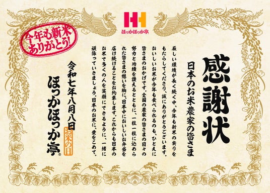 ほっかほっか亭が大切にしている炊きたてのおいしいお米を提供していただいている日本全国のお米農家の皆さまへ感謝を伝えるため、8月8日の“お米の日”に合わせて、田んぼに特大サイズの感謝状看板を掲出いたします。厳しい生産環境が続くなか、今年もおいしいお米の生産をしてくださることへの感謝の気持ちと、これからもお米農家の皆さまと共に、おいしいごはん、おいしいお弁当をお届けする決意を表明いたします。