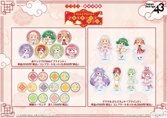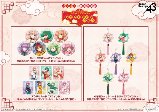 シェリルたちのイラストをアップで見られる缶バッジ(サイズ:5.7cm)や、背景のデザインもオシャレなアクリルカード(サイズ:9cm×7cm)、各キャラクターのイメージカラーのタッセルが付いた中華風タッセルキーホルダー、アクリルスタンド(サイズ:約15cm)、クリアポスター(サイズ:29.7 cm×42cm)など、ゲットしたいグッズばかり。