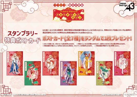 さらに、8月8日(金)~17日(日)の期間中、横浜中華街の対象店舗で、対象のメニューをご注文いただくと、専用のスタンプ台紙にスタンプを1個押印。POP UP SHOP内の景品交換所にて、スタンプが押印された専用台紙をスタッフにお見せいただくと、ポストカード(全7種)をランダムで1枚プレゼント!