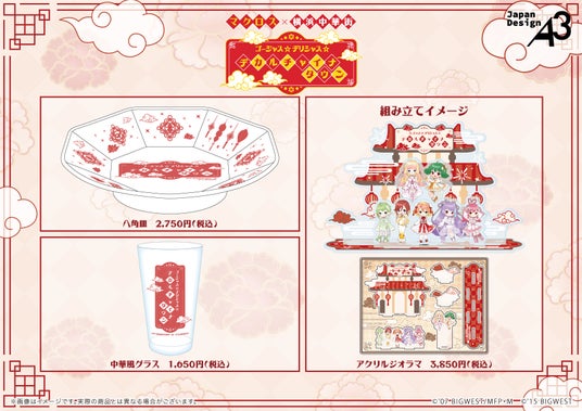 また、組み立てれば7人の歌姫がお迎えしてくれる雰囲気を立体的に味わえるアクリルジオラマ(サイズ:約20cm×34.5cm ※組み立て前)、チャーハンなどがより美味しく食べられそうな八角皿、ロゴがドーンと描かれた中華風グラスなど、普段使いしやすいアイテムも取り揃えました!
